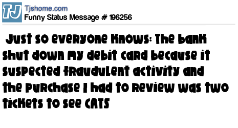 X says Just so everyone knows: The bank shut down my debit card because it suspected fraudulent activity and the purchase I had to review was two tickets to see CATS