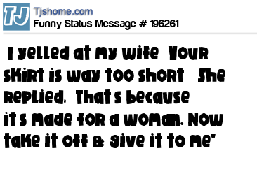 - # 207644 I just yelled at my wife “Your skirt is way too short” She replied, “That’s because it’s made for a woman. Now take it off & give it back to me"