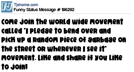 X is Come join the world wide movement called "I pledge to bend over and pick up a random piece of garbage on the street or wherever I see it" movement. Like and share if you like to join!