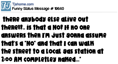 X there anybody else alive out there!?.. is that a No? If no one answers then I'm just gonna assume that's a "No" and that I can walk the street to a local gas station at 2:00 AM completley naked..."