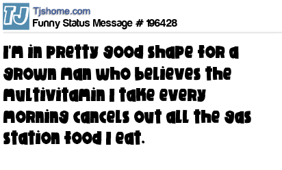 X says I'm in pretty good shape for a grown man who believes the multivitamin I take every morning cancels out all the gas station food I eat.