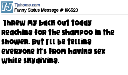 - # 186345 Threw my back out today reaching for the shampoo in the shower. But I'll be telling everyone it's from having sex while skydiving.