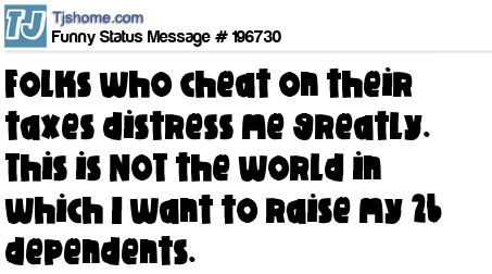 - # 208722 People who cheat on their taxes disgust me...this is not the world I want to raise my 32 dependents in! 😉