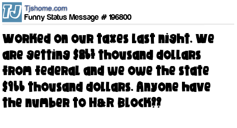 X is Worked on our taxes last night. We are getting $867 thousand dollars from federal and we owe the state $966 thousand dollars. Anyone have the number to H&R Block??