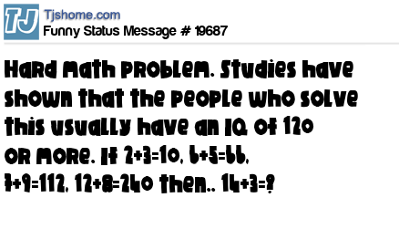 X Hard math problem. Studies have shown that the people who solve this usually have an IQ of 120 or more. If 2+3=10, 6+5=66, 7+9=112, 12+8=240 then.. 14+3=?