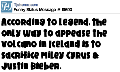 X is According to legend, the only way to appease the volcano in Iceland is to sacrifice Miley Cyrus & Justin Bieber.