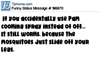 X says If you accidentally use Pam cooking spray instead of Off... It still works, because the mosquitoes just slide off your legs.