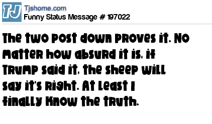 X is The two post down proves it. No matter how absurd it is, if Trump said it, the sheep will say it's right. At least I finally know the truth.