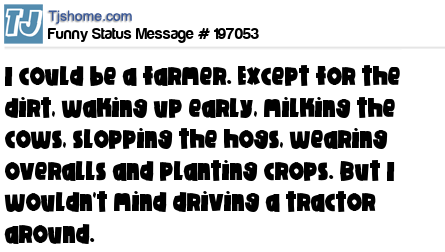 - # 36284 I think I could be a farmer. Except for the dirt, waking up early, wearing overalls and planting crops. But I wouldn't mind driving a tractor around.