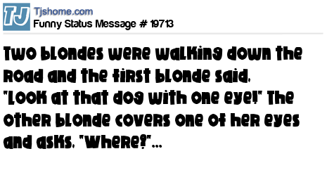 X Two blondes were walking down the road and the first blonde said, "Look at that dog with one eye!" The other blonde covers one of her eyes and asks, "Where?"...