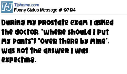 - # 170310 .... When I was waiting in the examination room for my prostate exam, When I asked the doctor where I should put my pants ... "Over there beside MINE" ... wasn't quite the answer I was expecting.