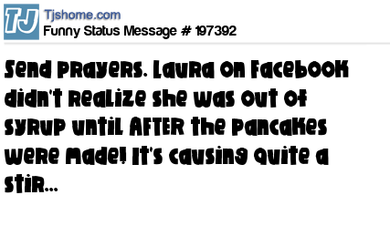 X says Send prayers. Laura on Facebook didn't realize she was out of syrup until AFTER the pancakes were made! It's causing quite a stir...
