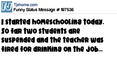 X says I started homeschooling today. So far two students are suspended and the teacher was fired for drinking on the job...