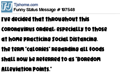 X says I've decided that throughout this Coronavirus ordeal; especially to those at home practicing Social Distancing, the term "calories" regarding all foods shall now be referred to as "Boredom Alleviation Points."
