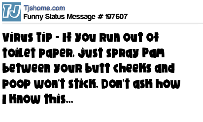 X says Virus Tip - If you run out of toilet paper, just spray Pam between your butt cheeks and poop won't stick. Don't ask how I know this...