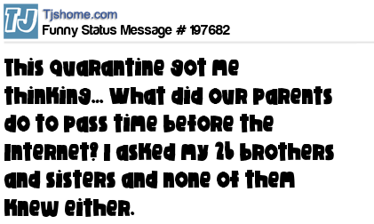 X says This quarantine got me thinking… What did our parents do to pass time before the Internet? I asked my 26 brothers and sisters and none of them knew either.