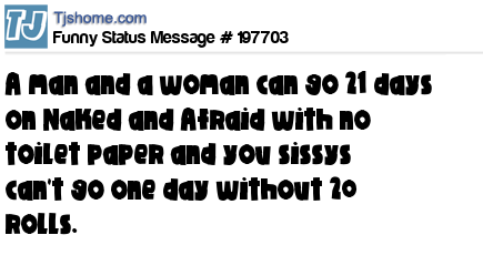 X says A man and a woman can go 21 days on Naked and Afraid with no toilet paper and you sissys can't go one day without 20 rolls.