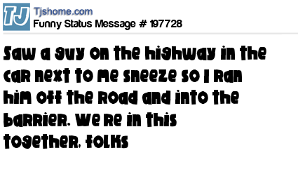 X says Saw a guy on the highway in the car next to me sneeze so I ran him off the road and into the barrier. We’re in this together, folks