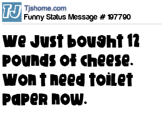 X says We Just bought 12 pounds of cheese. Won’t need toilet paper now.