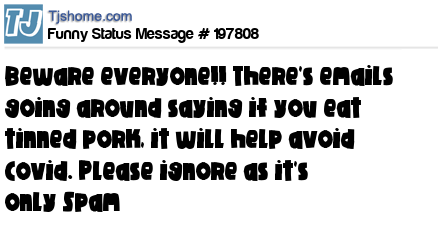X says Beware everyone!! There's emails going around saying if you eat tinned pork, it will help avoid Covid. Please ignore as it's only Spam