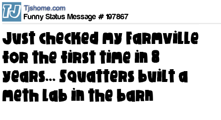 X says Just checked my Farmville for the first time in 8 years... Squatters built a meth lab in the barn