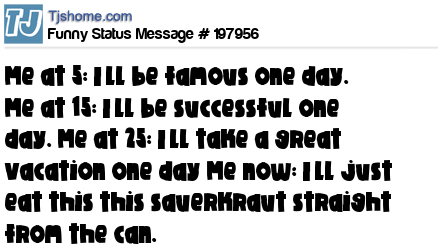 X says Me at 5: I’ll be famous one day. Me at 15: I’ll be successful one day. Me at 25: I’ll take a great vacation one day Me now: I’ll just eat this this sauerkraut straight from the can.