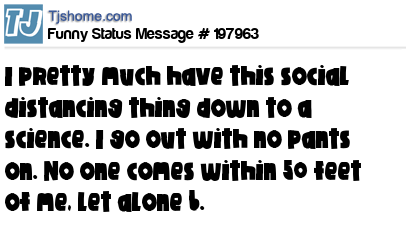 X says I pretty much have this social distancing thing down to a science. I go out with no pants on. No one comes within 50 feet of me, let alone 6.