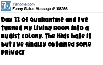 X says Day 22 of quarantine and I’ve turned my living room into a nudist colony. The kids hate it but I’ve finally obtained some privacy