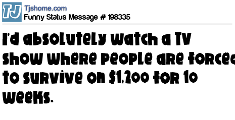 X is I'd absolutely watch a TV show where people are forced to survive on $1,200 for 10 weeks.