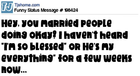 X says Hey, you married people doing okay? I haven't heard "I'm so blessed" or He's my everything" for a few weeks now...