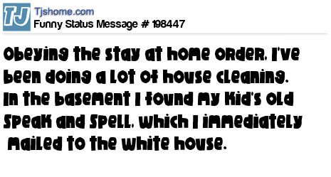 X is Obeying the stay at home order, I've been doing a lot of house cleaning. In the basement I found my kid's old Speak and Spell, which I immediately mailed to the white house.