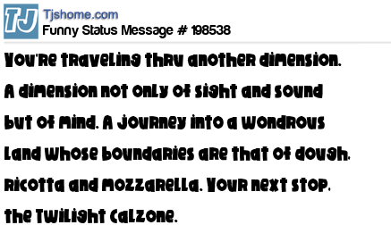 X says You're traveling thru another dimension. A dimension not only of sight and sound but of mind. A journey into a wondrous land whose boundaries are that of dough, ricotta and mozzarella. Your next stop, the Twilight Calzone.