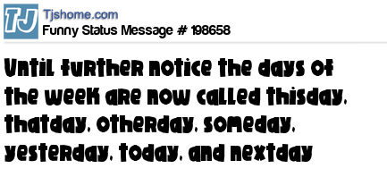 X is Until further notice the days of the week are now called thisday, thatday, otherday, someday, yesterday, today, and nextday