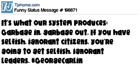X says It's what our system produces: Garbage in, garbage out. If you have selfish, ignorant citizens, you're going to get selfish, ignorant leaders. #GeorgeCarlin