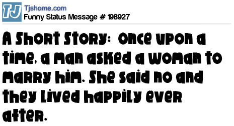 - # 25221 **shortest fairly tale**-->once upon a time, a guy asked a girl "will you marry me?" The girl said "NO!" The guy lived happily ever after..
