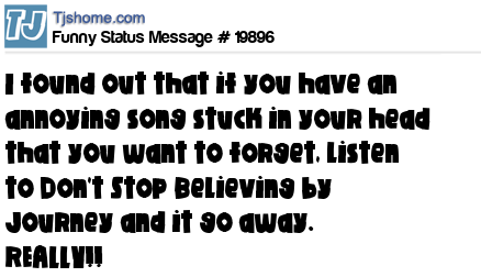 X says I found out that if you have an annoying song stuck in your head that you want to forget, listen to Don't Stop Believing by Journey and it go away. REALLY!!