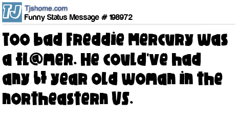 X says Too bad Freddie Mercury was a fl@mer. He could've had any 67 year old woman in the northeastern US.