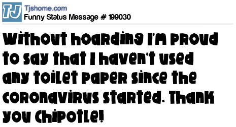 X is Without hoarding I'm proud to say that I haven't used any toilet paper since the coronavirus started. Thank you Chipotle!