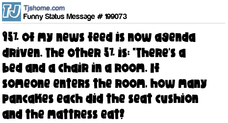 X says 95% of my news feed is now agenda driven. The other 5% is: "There's a bed and a chair in a room. If someone enters the room, how many pancakes each did the seat cushion and the mattress eat?