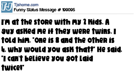 X says I'm at the store with my 2 kids. A guy asked me if they were twins. I told him, "One is 8 and the other is 4, why would you ask that?" He said, "I can't believe you got laid twice!"