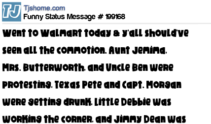 X says Went to Walmart today & y'all should've seen all the commotion. Aunt Jemima, Mrs. Butterworth, and Uncle Ben were protesting, Texas Pete and Capt. Morgan were getting drunk, Little Debbie was working the corner, and Jimmy Dean was showing everybody his sa