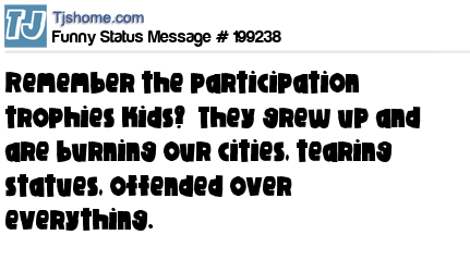 X Remember the participation trophies kids? They grew up and are burning our cities, tearing statues, offended over everything.