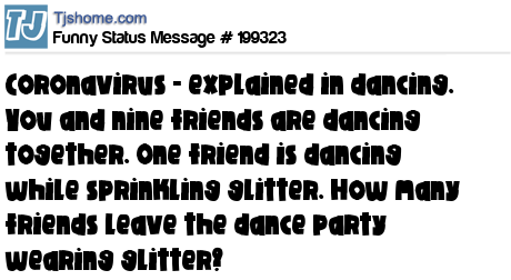 X is Coronavirus - explained in dancing. You and nine friends are dancing together. One friend is dancing while sprinkling glitter. How many friends leave the dance party wearing glitter?