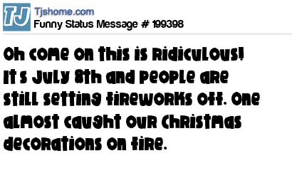 X says Oh come on this is ridiculous! It’s July 8th and people are still setting fireworks off. One almost caught our Christmas decorations on fire.