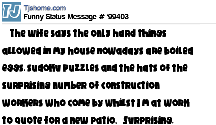 X says The wife says the only hard things allowed in my house nowadays are boiled eggs, sudoku puzzles and the hats of the surprising number of construction workers who come by whilst I’m at work to quote for a new patio. Surprising, because we live in
