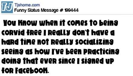 X is You know when it comes to being corvid free I really don't have a hard time not really socializing seeing as how I've been practicing doing that ever since I signed up for Facebook.