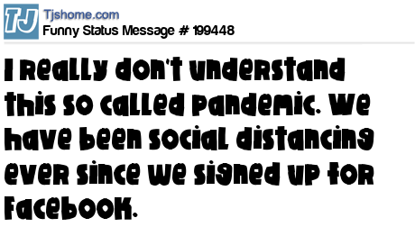X says I really don't understand this so called pandemic. We have been social distancing ever since we signed up for Facebook.