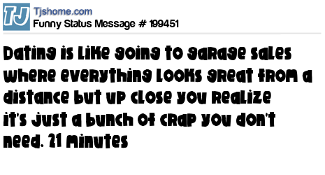 - # 194646 Dating is like garage sales where everything looks great from a distance but up close you realize it's just a bunch of crap you don't need.