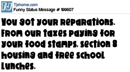 X says You got your reparations. From our taxes paying for your food stamps, section 8 housing and free school lunches.