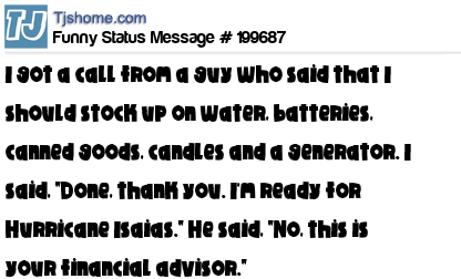X says I got a call from a guy who said that I should stock up on water, batteries, canned goods, candles and a generator. I said, "Done, thank you. I'm ready for Hurricane Isaias." He said, "No, this is your financial advisor."